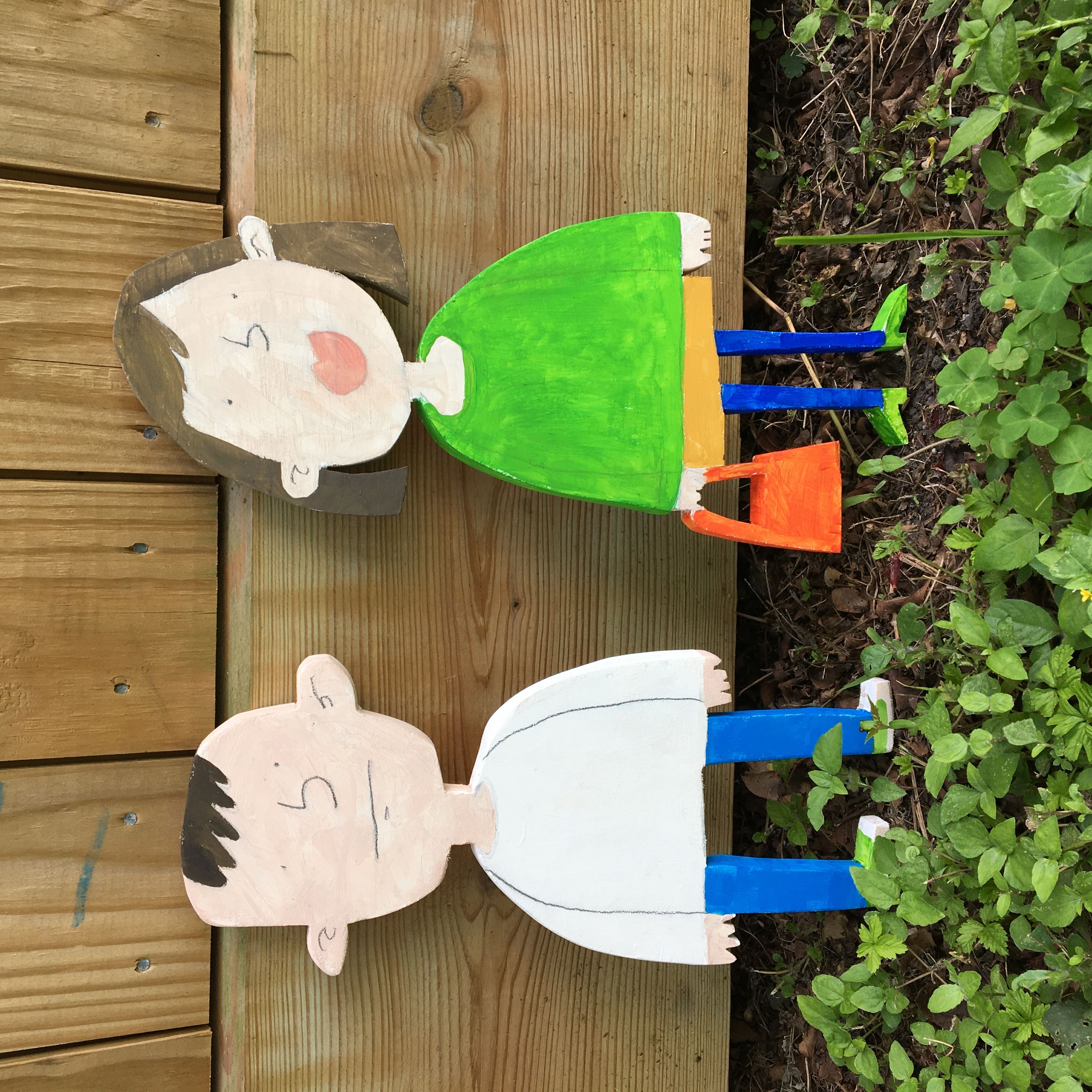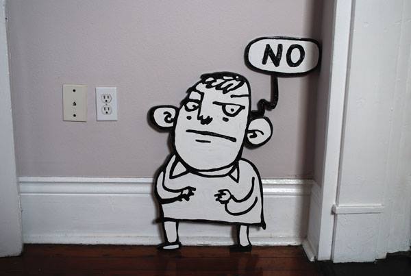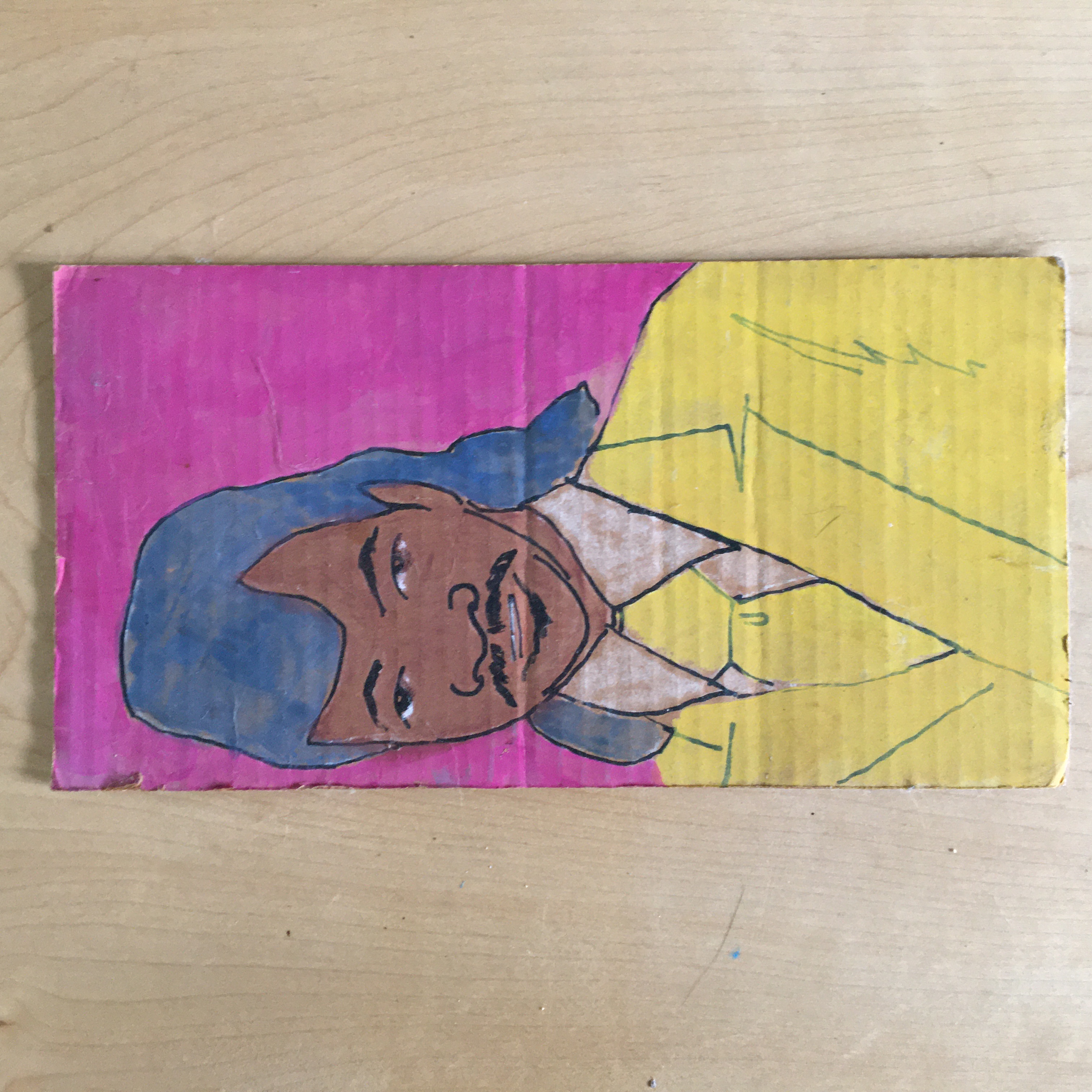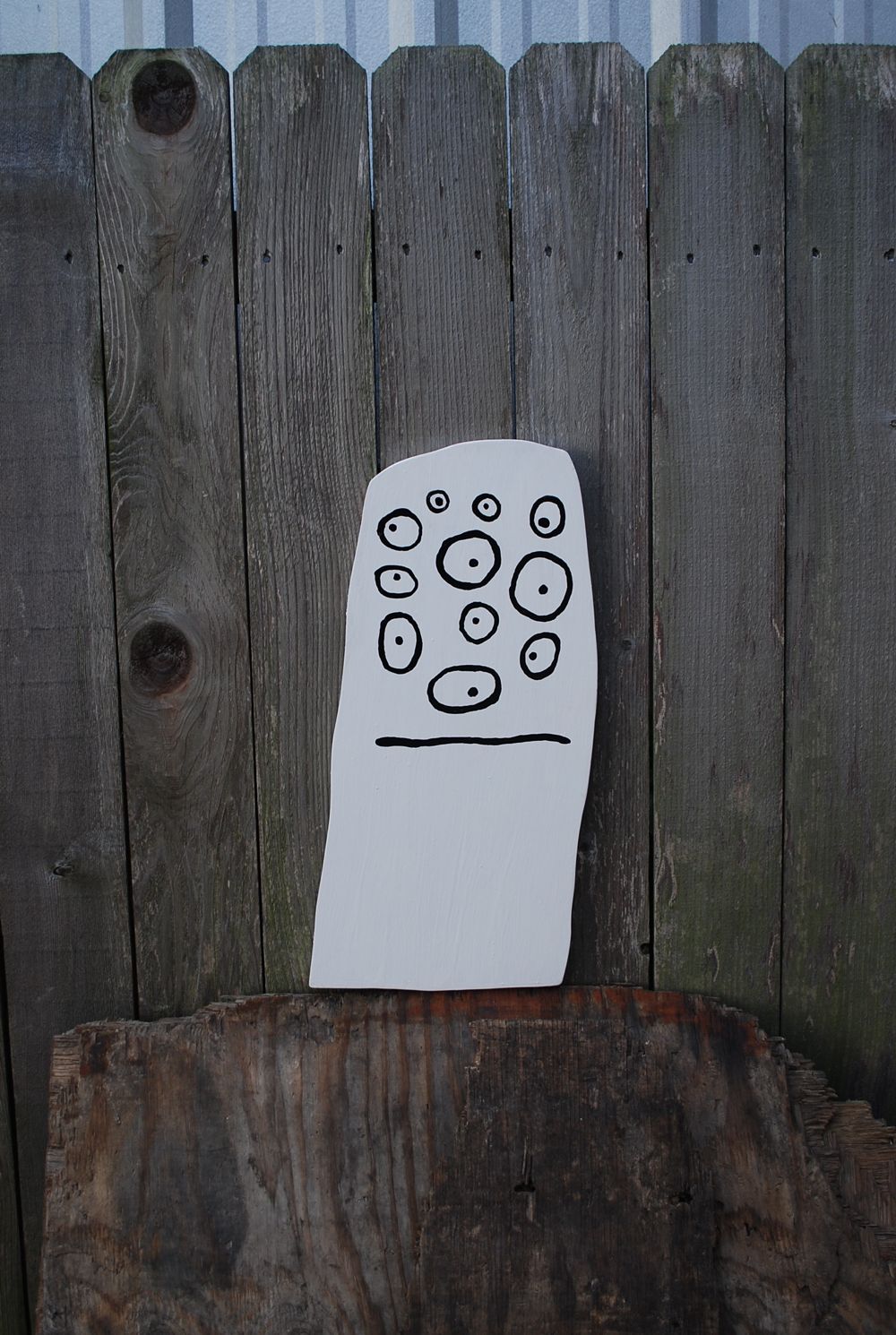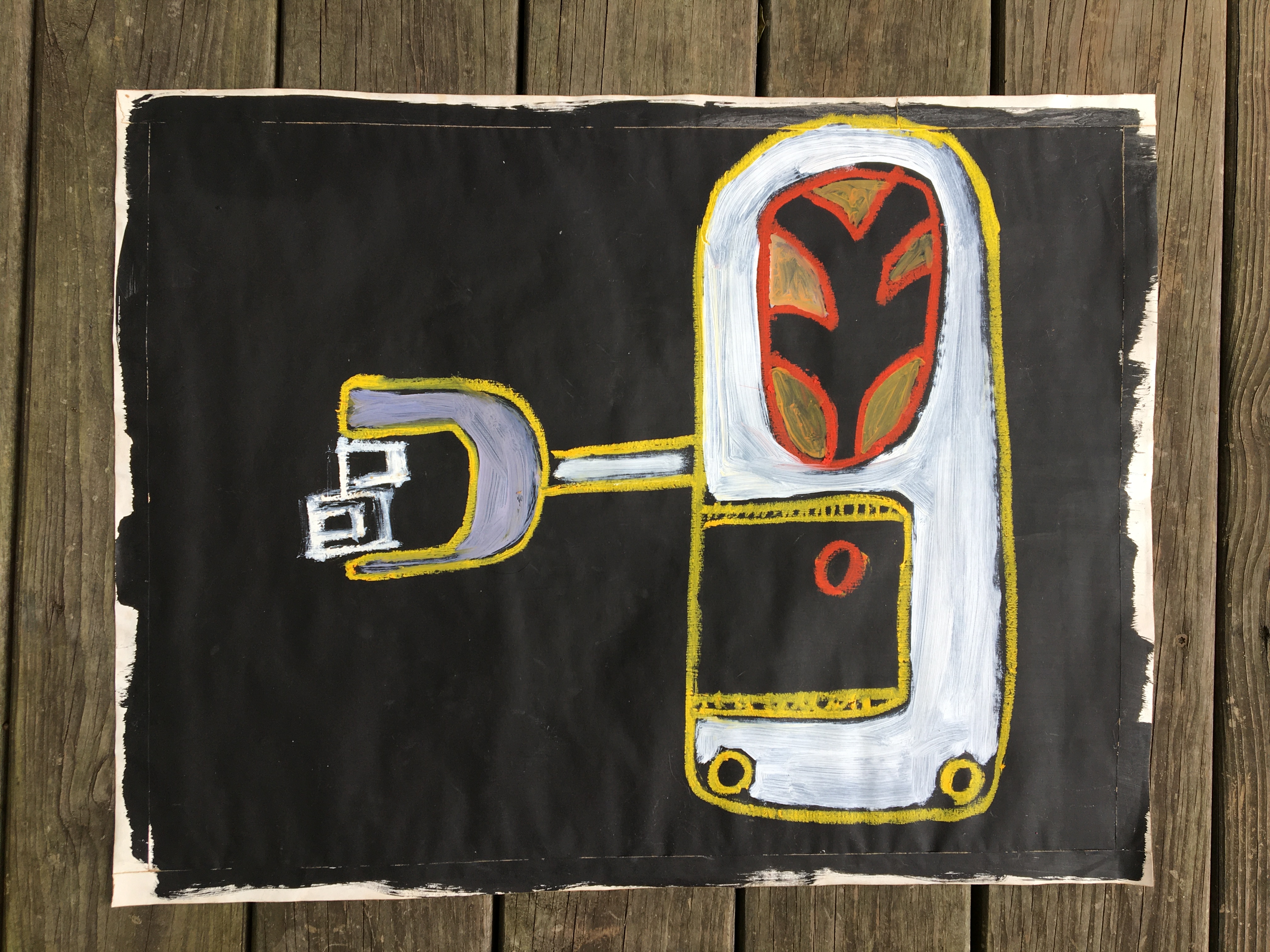 enamel on plywood. metal rod, shoestring 12" × 18" $120