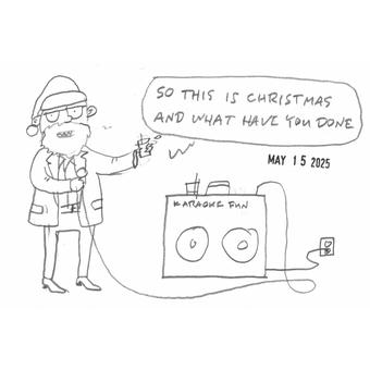Christmas December 25, 1976 Influences: we got an 8-track tape of folk songs for Christmas. Turns out Folk encompasses a lot of kinds of music. December 25, 2006 Spent Christmas morning with Miles the rabbit. He was a good rabbit. You just had to make sure he didn't eat the drywall. December 25, 2020 Gina got me exactly what I wanted for Christmas. She heard me talk about More Zingers From The Hollywood Squares, I didn't know I was dropping a hint. December 24, 2021 Gina put up the traditional Christmas bamboo. December 25, 2021 We had a Christmas bonfire at Gina's. December 25, 2021 Gina gave buddy a cardboard scratcher for Christmas. May 13, 2025 I did a cartoon about a song I dislike. I like "Simply Having A Wonderful Christmas Time" a lot. This one not so much. December 25, 2025 I saw a beautiful thing today. I saw a man on St. Roch avenue, near St. Claude. He was pushing a yellow Dollar General shopping cart full of unidentifiable junk. ← Timeline index
