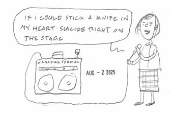 Fallin' In Love August 2, 2025 I did two more karaoke cartoons. I decided to just turn on the radio and draw the next funny lyric I heard. I hope this one was funny enough. ← Timeline index