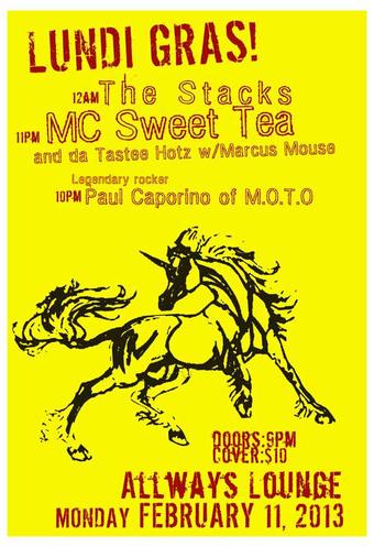 M.C. Sweet Tea February 11, 2013 The Stacks played Allways Lounge on Lundi Gras with M.C. Sweet Tea. Paul Caporino from M.O.T.O. was on this bill as well? ← Timeline index