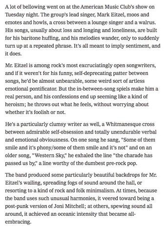 New York City May 25, 1993 I saw American Music Club at Irving Plaza. Apparently Liz Phair was also on the bill but amusingly I don't remember that. October 9, 1993 Saw Mark Eitzel at Acme. It was too noisy a venue. February 22, 1994 Saw Buddy Ebsen and Nick Heyward at a live taping of Conan. Apparently Al Franken was also on the show but amusingly I don't remember that. May 28, 1994 I saw Magnetic Fields at Brownie's. The woman on drums was tipsy and giggly. Stephin Merritt looked miserable. January 6, 1996 I survived the NYC Blizzard of 1996. We saw....CB4. November 28, 2010 I visited the Cooper-Hewitt Museum. Usually I like it, but on this day, if I had to describe it in a sentence, I’d say it was like a field trip to a Muji. August 6, 2011 Avatar painting in my Bushwick place, Rent then was a mere $1400 for one long room. August 8, 2011 The Dave Rhoden Band planned a rehearsal. July 26, 2022 I had possibly the most intense dream of my life. ← Timeline index